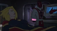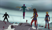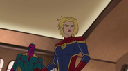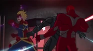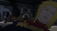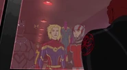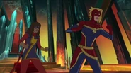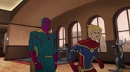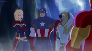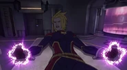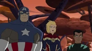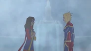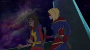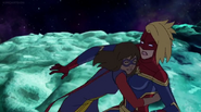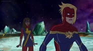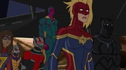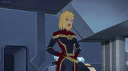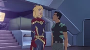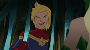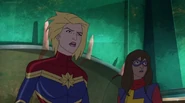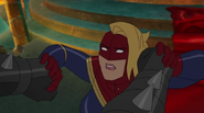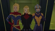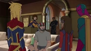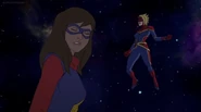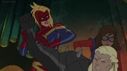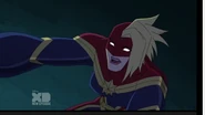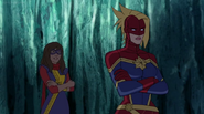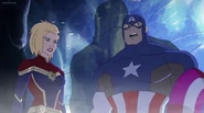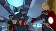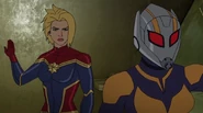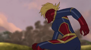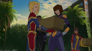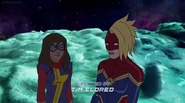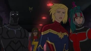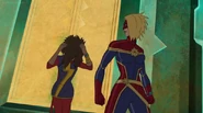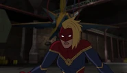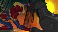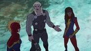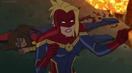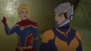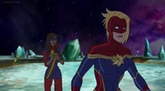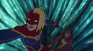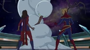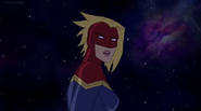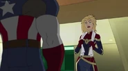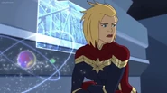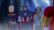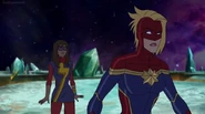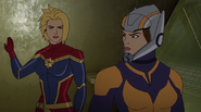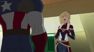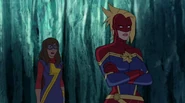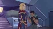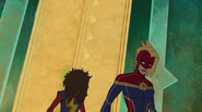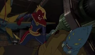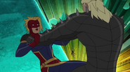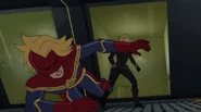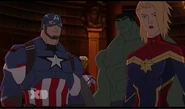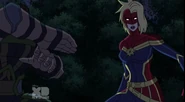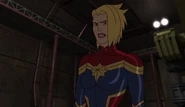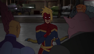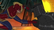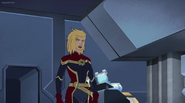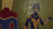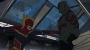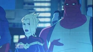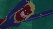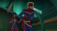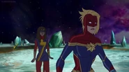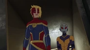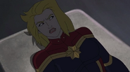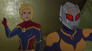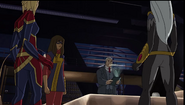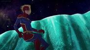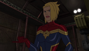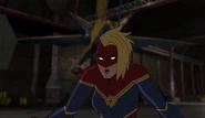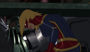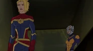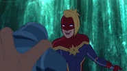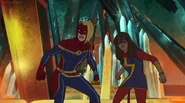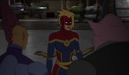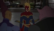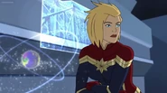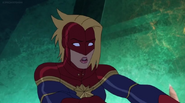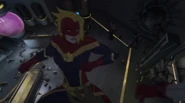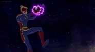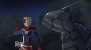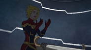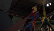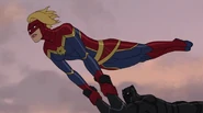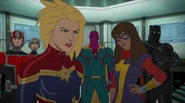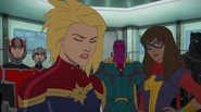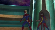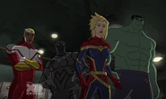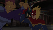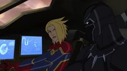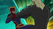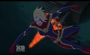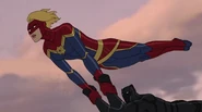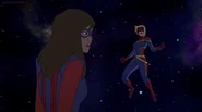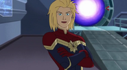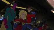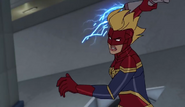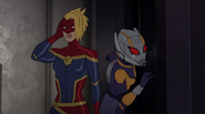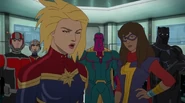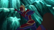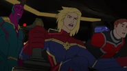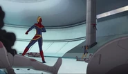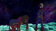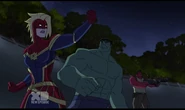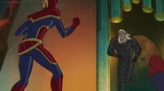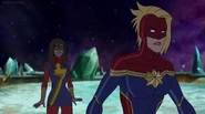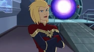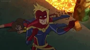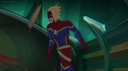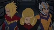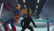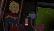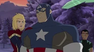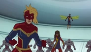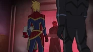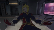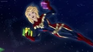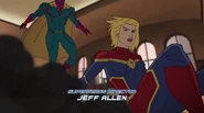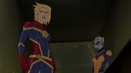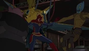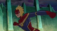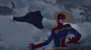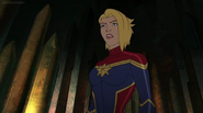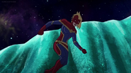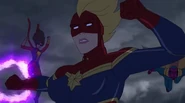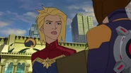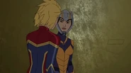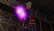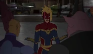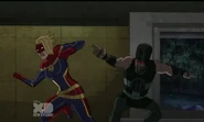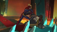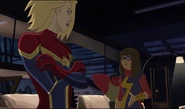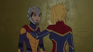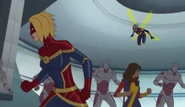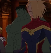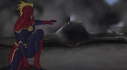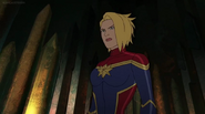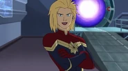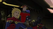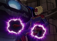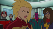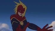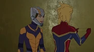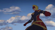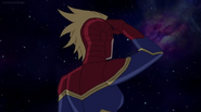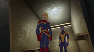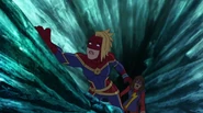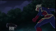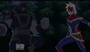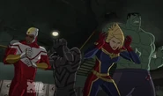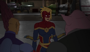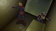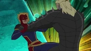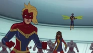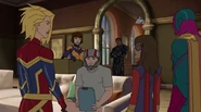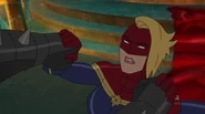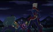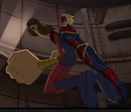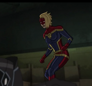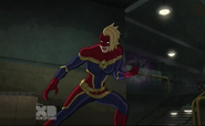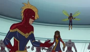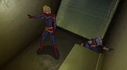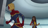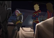While Captain Marvel largely worked alone in protecting the galaxy, she did team up with the Avengers Captain America, Falcon, and Thor to defeat Galen-Kor, a Kree militant that intended to kidnap Inhumans and weaponize their powers to expand his empire. She and Captain America were especially prone to disagreement on how to handle the situation, but eventually put their differences aside to save Galen-Kor's abductees. Impressed, the Avengers offered Captain Marvel reserve membership on the team, which she was happy to consider.[3]