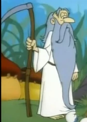 Father Time is a character that has appeared in the 1980s Smurfs cartoon show from Season 3's "How To Smurf A Rainbow" to Season 9's "The Smurfs That Time Forgot". He is an elderly figure who has power and control over time, if not complete control. He wears a long grey beard, is dressed a long robe, and carries a scythe in his hand, which can open up tears in the fabric of space and time by careless people wielding it. He has an underground workshop usually accessible from a cave entrance, in which he has all sorts of devices and apparatuses that control elements of time. One of these devices, a backwards-running grandfather clock, had turned three adult Smurfs into young Smurflings. He has an unexplained relationship with Mother Nature.