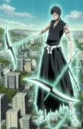 After the combatants are separated by an explosion, Hisagi battles and defeats an unknown Sternritter. He approaches Byakuya and informs him of this, only to find that the captain has already defeated three Sternritter. Thinking about the captain's strength and questioning why he was being so prideful over one battle, Hisagi suddenly attacks Byakuya, who blocks the attack. Asking the captain what was wrong, Byakuya asks if Hisagi is under someone's control or an imposter. Hisagi denies this, and claims to be doing this for "PePe-sama" before lunging at the captain. Byakuya soon injures Hisagi enough to immobilize him. PePe uses his ability on Byakuya's Zanpakutō, Senbonzakura, which prompts the captain to discard it. Thanks to the influence of PePe's love ability, Hisagi is able to get back up and retrieve it. He then attacks Byakuya with both Senbonzakura and his own Zanpakutō. Byakuya tries to fend him off with just Hakuda, before PePe unleashes his Quincy: Vollständig against Byakuya and tells Hisagi to stop. After the zombified Kensei and Rōjūrō Ōtoribashi arrive, Hisagi attempts to attack Kensei from behind, only for the latter to swiftly incapacitate him.